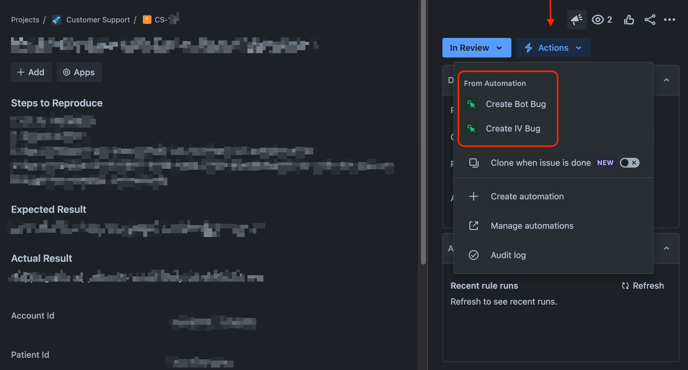 - [Product/Engineering] In the Actions menu, select Create BOT or IV Bug. When the automation is complete, a ticket is created and automatically linked to the CS ticket. The CS ticket is transitioned to “Done” and Resolution = Sent to Dev.