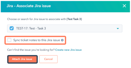 - NOTE: for both options above, do NOT check “sync ticket notes and comments to this Jira issue.” In testing, this was not found to be helpful but to create more noise in HubSpot.