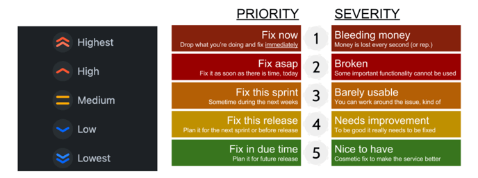 - Product triages issues with special attention given to issues deemed high priority; use your best judgment with the Priority/Severity table below on the right to set the Priority of the issue on the left.