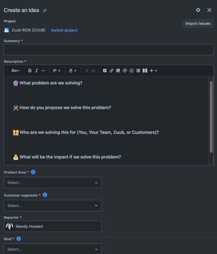 - To submit a new feature request in the Zuub RCM (ZUUB) project, use the Idea template in Jira (Product Discovery) to submit a new idea. All fields are required.