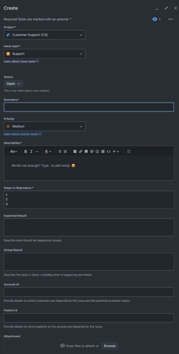 - TechOps can submit a new issue in the Customer Support (CS) project using the support issue type in Jira. All fields are required; use N/A if appropriate.