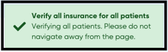 - That will cause all of the patients' insurance icons to blink until their verifications come back. You will also see a green notification message box at the top right hand corner that will remind you to not navigate away from the page until all the verifications come back.