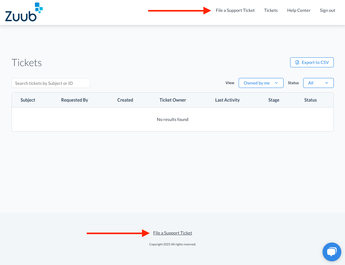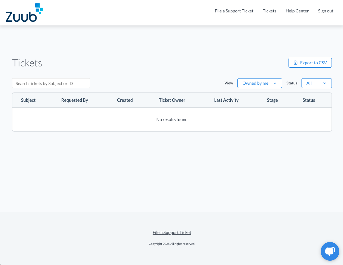 - Reach out to your Customer Success Manager (CSM) via chat or email and request access to the Customer Ticket Portal. They will update you status on Zuub's end which will send you an invite to setup your Customer Ticket Portal access.