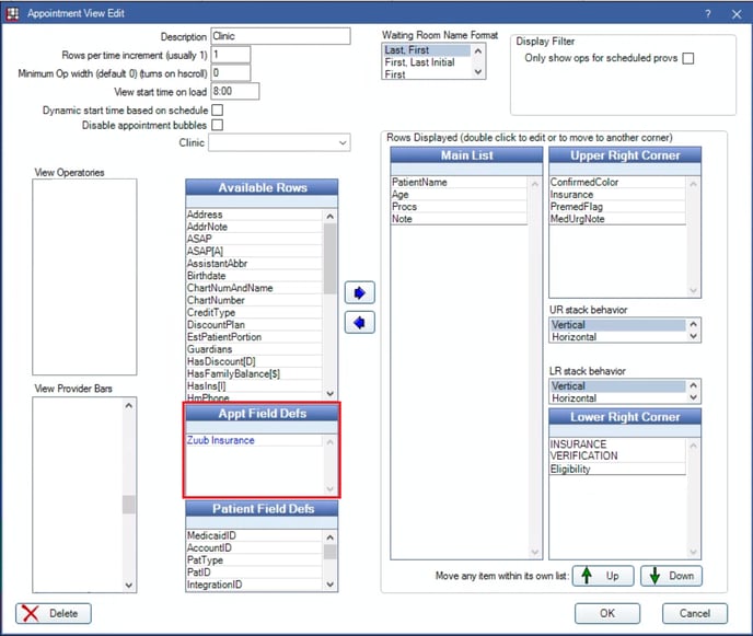 Repeat for each Appointment View and each Clinic as needed. Ensure the "Zuub Insurance" option is in the "Lower Right Corner" section for each.