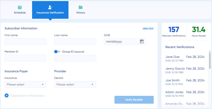 Insurance Verification Tab: Navigate to the Insurance Verification tab in the Insurance Verification module. This will display a manual form that can be used to verify patients. This tab should only be used for patients that are not of record, as nothing is written back or uploaded into your Open Dental, even if there are successful verifications from this tab.