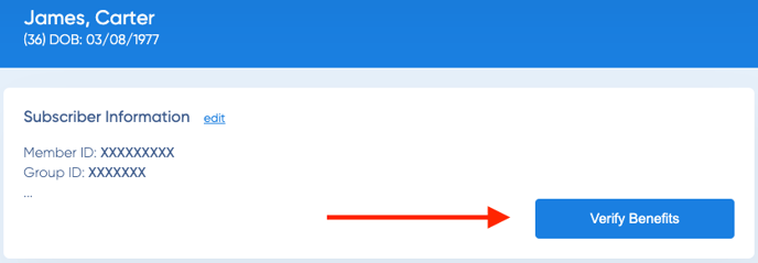Patient Look-up: Navigate to the "Search for patients" field at the top of the Zuub Portal view and start typing in the patient's name. A list will populate, where the correct patient can be selected. Once selected, the patients breakdown will be presented, where you can select "Verify Benefits" and verify the patient without having to add them to the schedule.