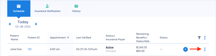 Schedule View: Navigate to the date the patient is scheduled. Find the patient on the schedule, and scroll to the right hand side of the patient's information to click on the three dots. Click on the three dots and select "Verify Now" from the dropdown.