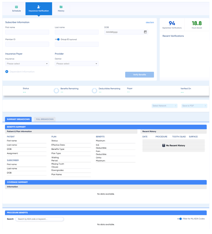 We've improved the user experience for manual insurance verification. When you select this option, you'll now see a detailed, code-centric breakdown that matches the information available in the Schedule view. When a patient is selected from "Recent Verifications," the breakdown loads for that patient. Clicking "Clear Form" clears the form and the breakdown.