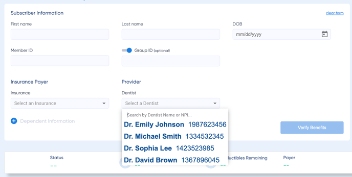 We've improved the provider selection dropdown to display both the provider's name and NPI number. This enhancement ensures each provider is uniquely identified, making the selection process clearer and more accurate. Additionally, all NPI numbers associated with the organization will now appear in the dropdown, providing a comprehensive list for selection.