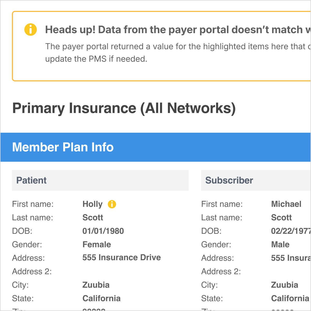 Zuub syncs patient and subscriber names, dates of birth, member IDs, and group IDs from the PMS. When an insurance verification runs, Zuub compares the synced data to the data retrieved from the payer.